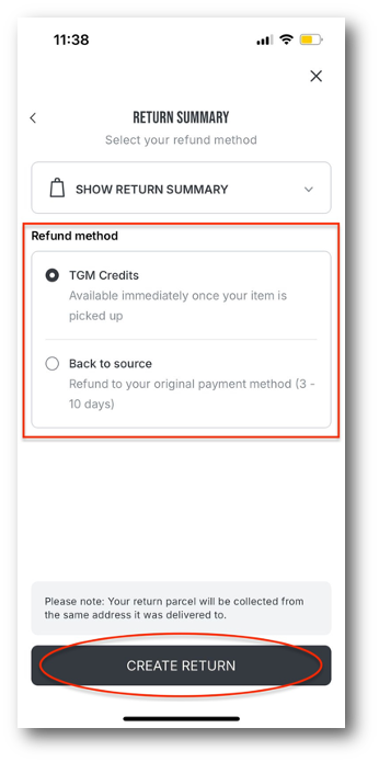 7. Select your refund method, and then click on 'CREATE RETURN'.